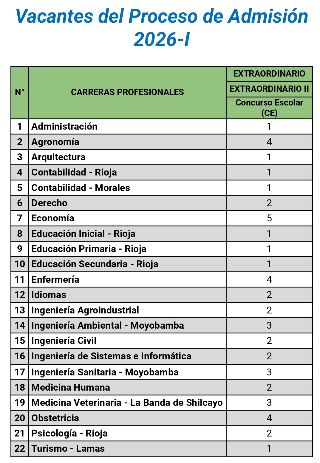 Consulta el cuadro oficial de vacantes disponibles para cada carrera y modalidad de admisión en el proceso actual. Esta información se actualiza por cada proceso de admisión.